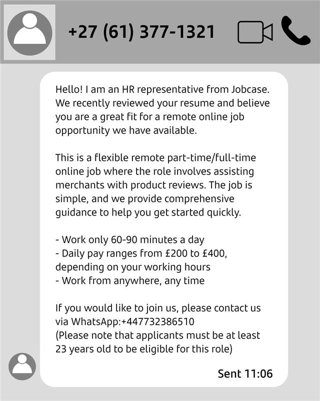 The data shows that the most common tactics used by criminals were online job scams, which accounted for £226,125 stolen. This scam sees customers enticed by the offer of a job, then asked for upfront payments for courses, or background checks to be completed. Insight from Santander shows that around one in five of these scams start via a WhatsApp message similar to the below.