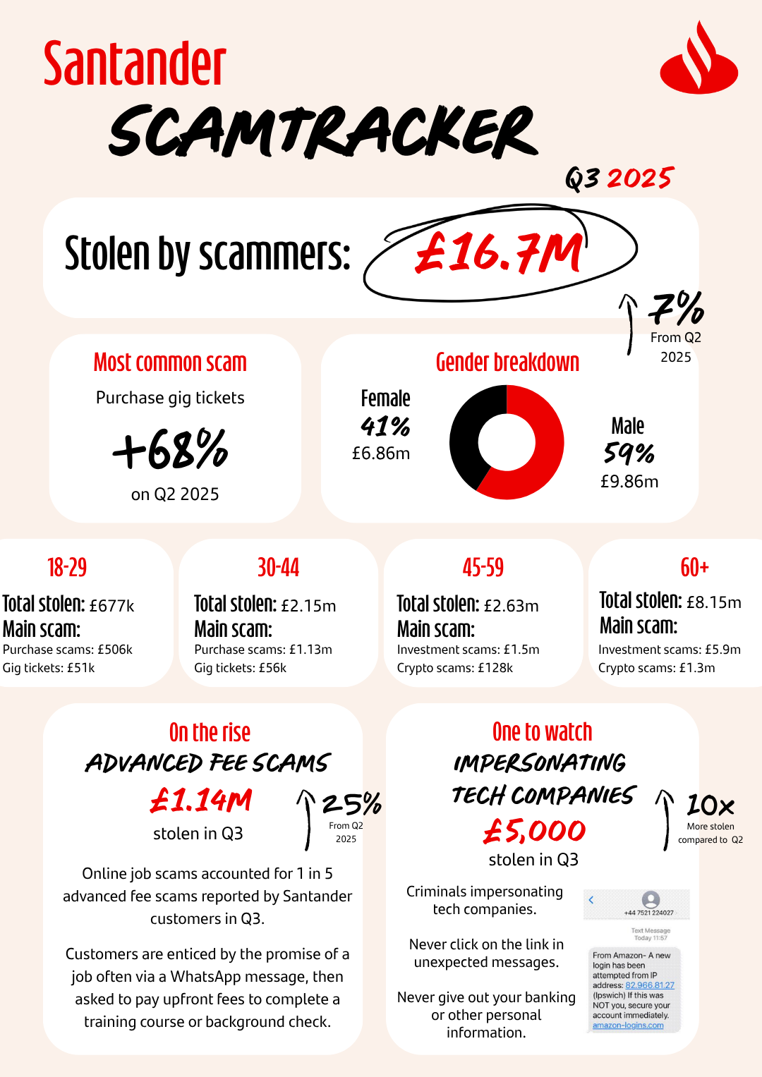 Santander UK is today launching its latest ‘Santander Quarterly Scamtracker’, which shows that a total of £16.7 million was stolen from customers between July and September 2025, a 7% increase on the figure reported by the bank in Q2.