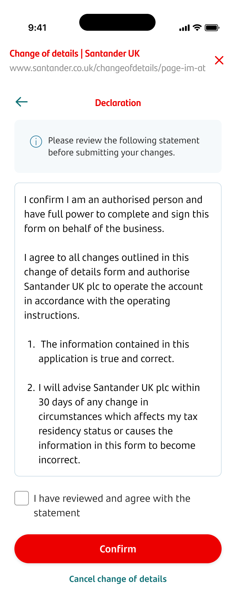 - We'll then ask you to read and confirm the declaration. When you’re happy, you can tick the box to confirm this before tapping ‘Confirm’.