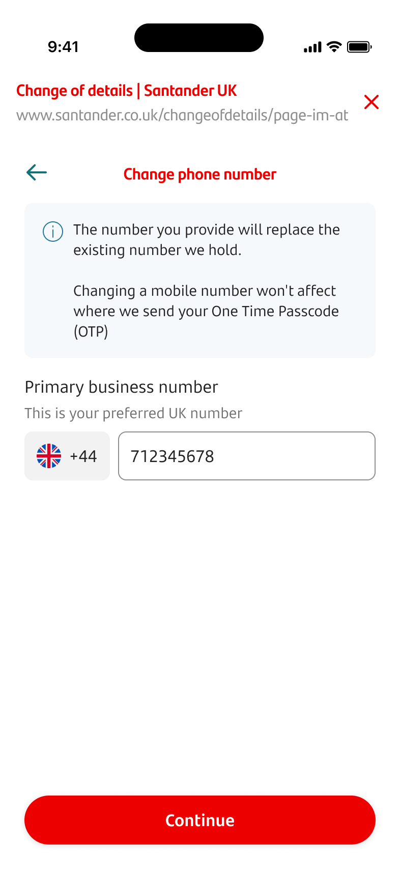 - You’ll only see your preferred number here. Any new mobile number you give us won’t change where we send your One Time Passcodes (OTPs). If you need to change your OTP number, you’ll need to call us.