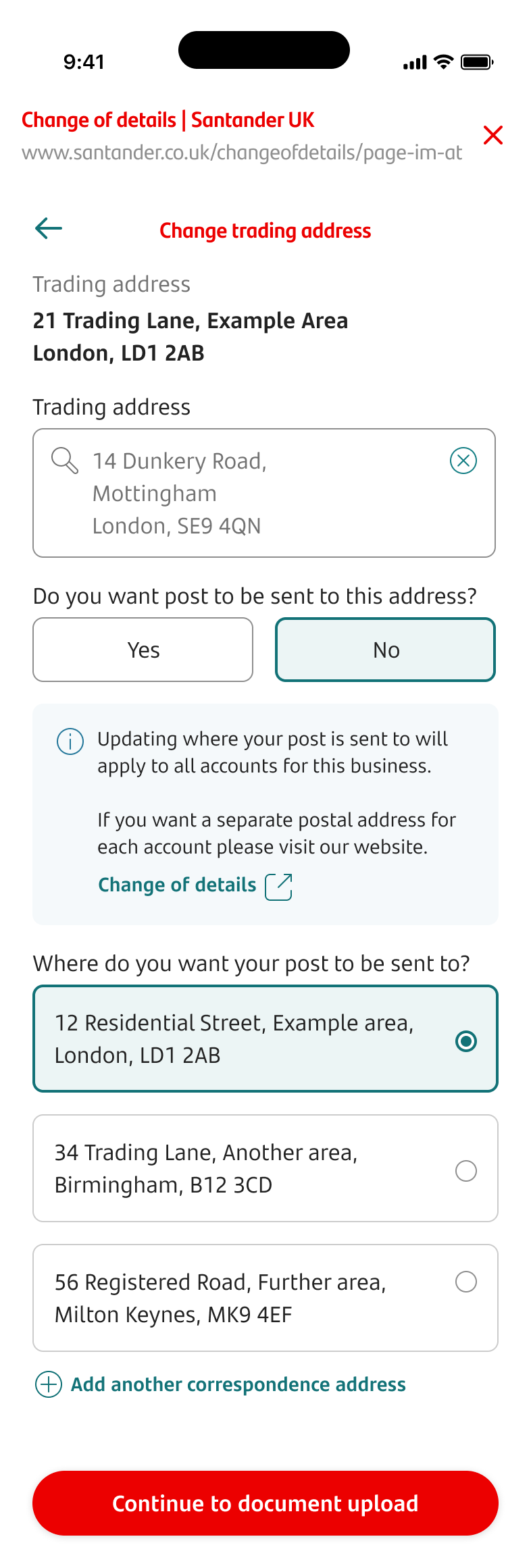 - This will change the correspondence address to all accounts for the business and must match either the trading address, registered address or a correspondence address we hold.