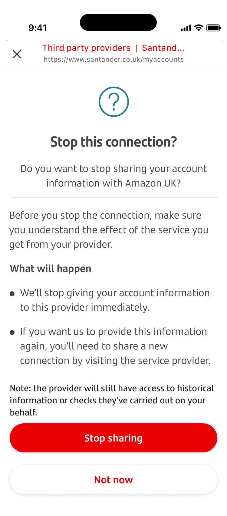 - Next, you’ll be asked to confirm if you want to stop sharing your account information with this third-party provider.