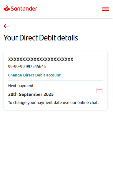 When you’re in the ‘Manage my mortgage’ screen you can tap on ‘Direct Debit details’ to view and change your Direct Debit. You’ll see the details of your current Direct Debit. To change the account you pay from tap ‘Change Direct Debit account.’