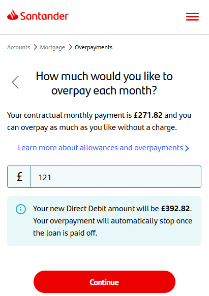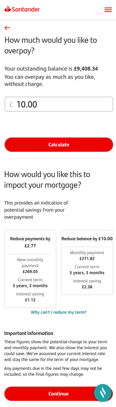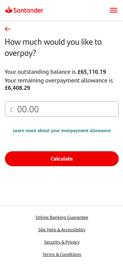 If your mortgage has an early repayment charge, we’ll show your remaining overpayment allowance here. We’ll give you an option to tap ‘learn more about your overpayment allowance.’