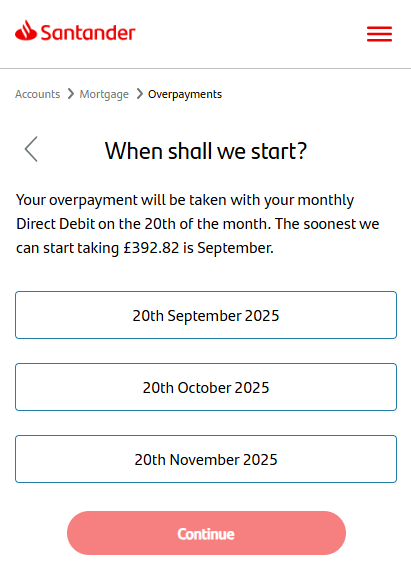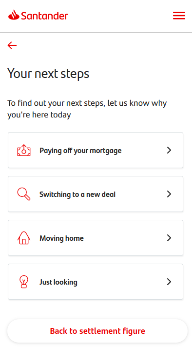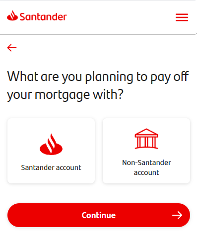 If you’ve selected a settlement date of ‘today’ and you’re eligible to pay your mortgage off online, you’ll see this screen next. This is where you can choose if you’re paying from a Santander account or an account with another bank.
