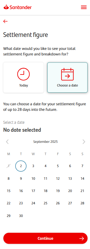 If you tap ‘Get a Settlement Figure’ on the ‘Manage my mortgage’ screen, you can choose a date for your settlement figure. This can either be for today or a date up to 28 days in the future.