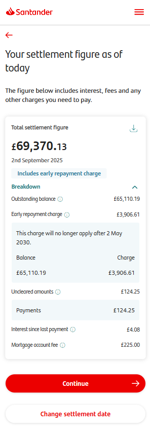 Tapping continue will show you your settlement figure. You can tap ‘Breakdown’ to see more details. You can change the settlement date or continue.