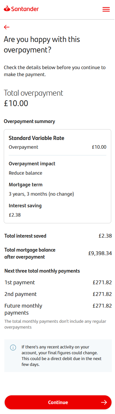 Once you've picked your dates, you'll be shown the details of your overpayment and new Direct Debit amount to review. When you’re happy you can tap ‘confirm set up’ to finish setting this up.