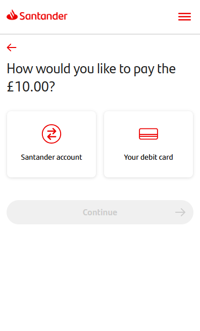 If you have a Santander account, we’ll give you the choice to pay from your account or using your debit card. If you don’t, we’ll take you straight to the pay by debit card screen.