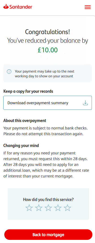 Once you’ve made the overpayment, you’ll see a confirmation screen with more information. You’ll have the option to download an overpayment summary here.