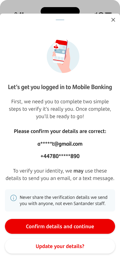 You may also receive an email. We’ll tell you in the app if we send you this. You’ll need to open the email on your device and click the link to log on to Mobile Banking. Once this is done successfully, you’ll be able to log on to the app.