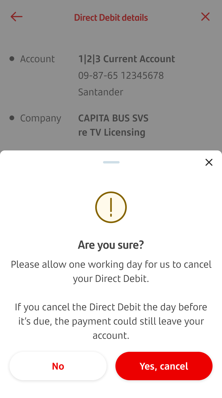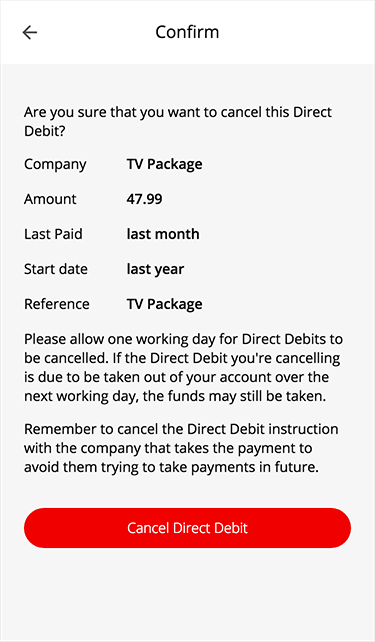 You can view your Direct Debit in detail, if you no longer need to have it set up, you can tap ‘Cancel Direct Debit’. You should also let the company, you're paying the Direct Debit to, know in case they try to set it up again.